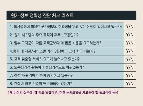 위 가이드의 8가지 질문 중 4개 이상이 “예”라면, 현재 우리 회사가 사용하는 원가모델이 보다 정확한 데이터를 반영하는 효율적 모델로 개선이 필요함을 나타냅니다.