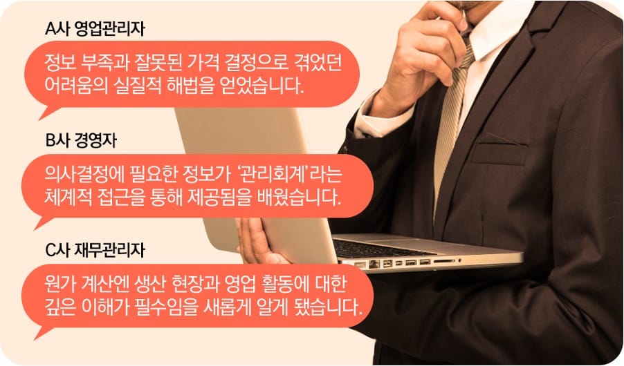 참가자들은 이번 미니 MBA 세미나를 통해 지금까지 의사결정에 활용하는 정보를 잘못 알고 있었던 부분을 새롭게 인지하고, 의사결정에서 활용할 수 있는 부분을 생산, 영업 관리자까지 함께 이해하고 경영 의사결정에 활용하는 구체적인 방안을 얻을 수 있었습니다. 특히 ▲생산성 개선 ▲ 고객 수익성 분석 ▲의사결정이라는 3가지 주제를 중심으로, 풍부한 글로벌 선진기업의 사례와 실제 프로젝트 경험이 공유되었습니다.