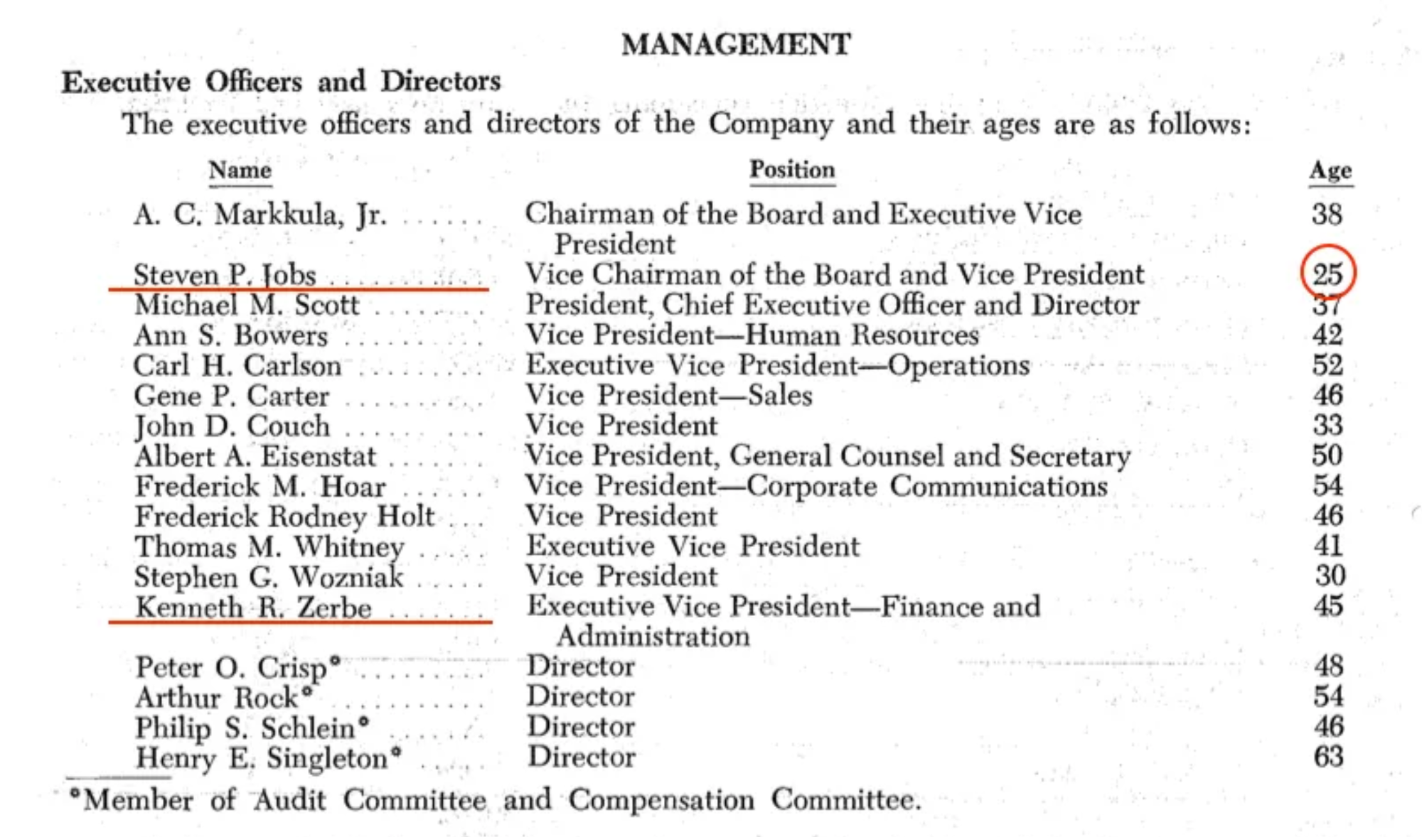 (아래는 1980년 당시 애플 이사회 명단으로, 25살의 잡스와 재무담당 임원의 구성을 보여줍니다.)