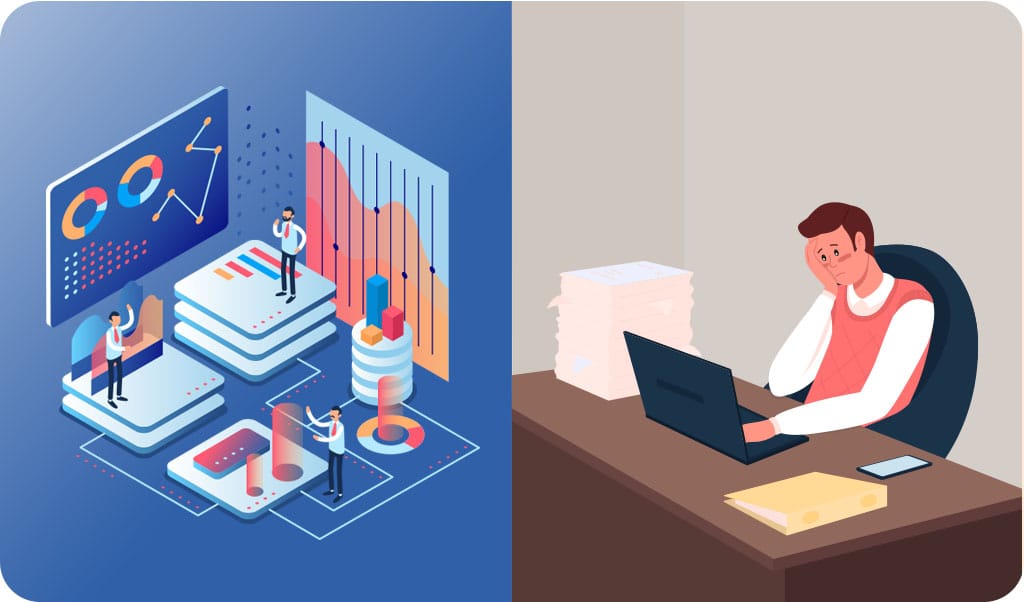 이렇게 DX를 시작해서는 투자 대비 효용이 낮은 결과로 이어질 수 있습니다. 시스템 초기 세팅 단계에서 표준화, 데이터 이관, 직원 교육 등에 상당한 비용과 시간이 소모되나, 막상 구축 후에는 기존 엑셀 업무를 단순히 시스템화 한 수준에 그치는 사례가 적지 않습니다.